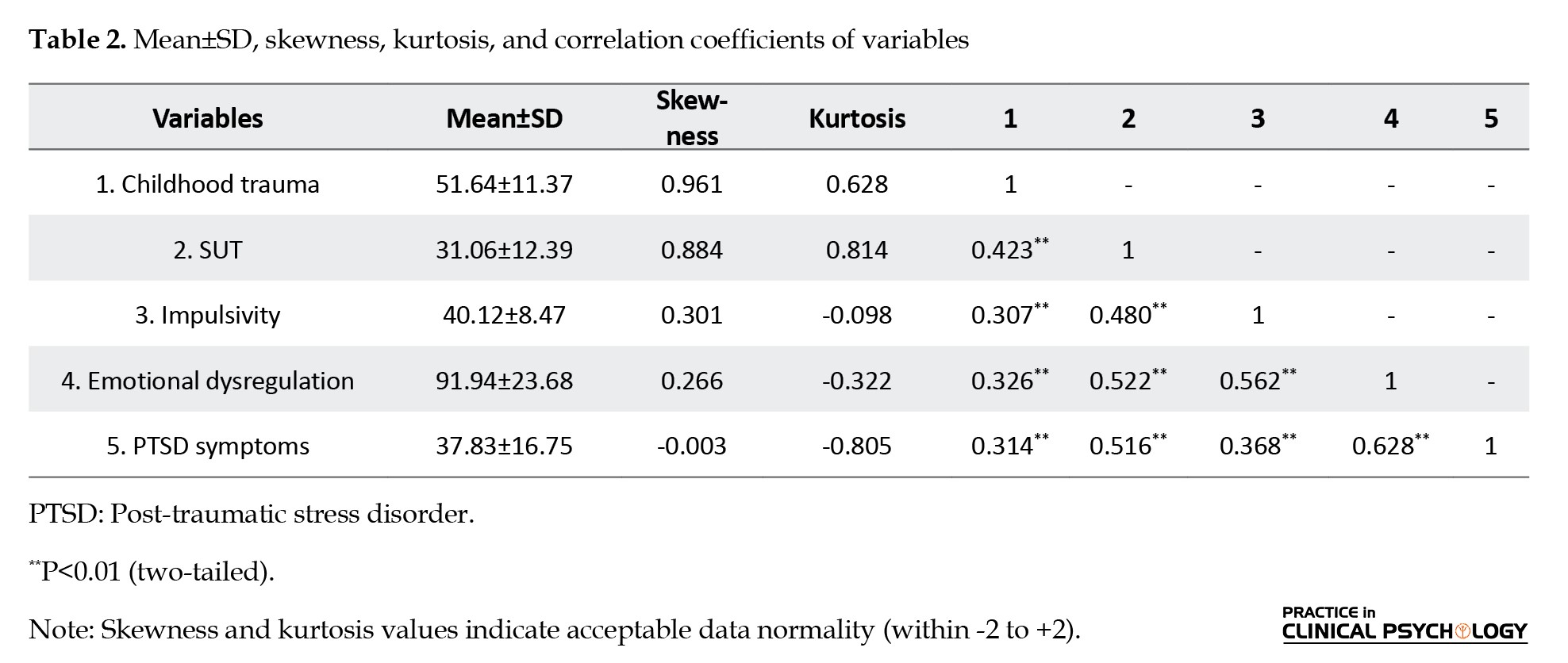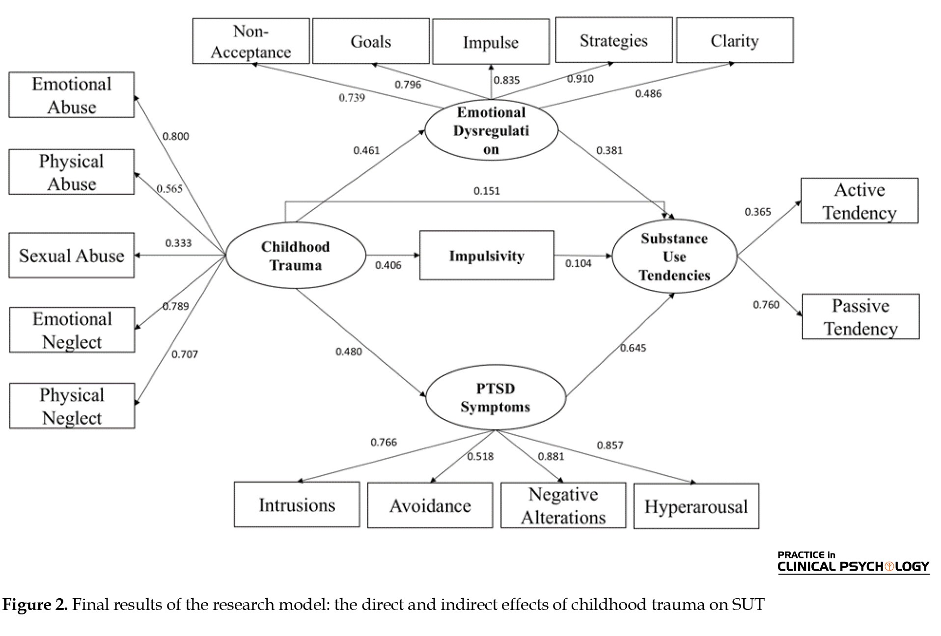 The results extrapolate prior studies by combining various mediators (emotional dysregulation, impulsivity, and PTSD symptoms) in one model in a non-psychiatric, culturally high population. This study also shows the importance of these mediators in a non-clinical sample of Iranian students, who, due to cultural circumstances (such as stigma and emotional suppression), might have stronger psychological vulnerabilities (Farnia et al., 2018) than those reported by Wang et al. (2020). This clinical sample that is specific to the types of trauma in addition to characteristics of clinical groups. The high correlation between the presence of emotional dysregulation and substance use found (r=0.522, P<0.01) agrees with what Mandavia et al. (2016) established in their research: emotional dysregulation is an intermediary in the interplay between childhood emotional abuse and lifelong substance use. Similarly, Ramakrishnan et al. (2019) found that positive urgency is an essential dimension between childhood maltreatment and substance use, supporting the mediating performance of impulsivity.