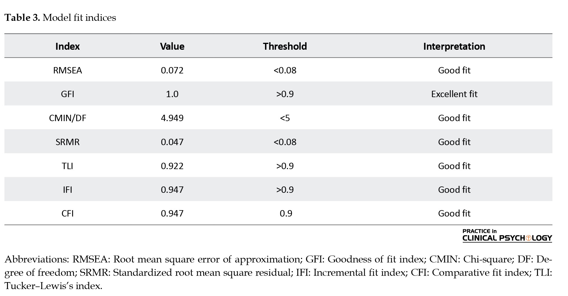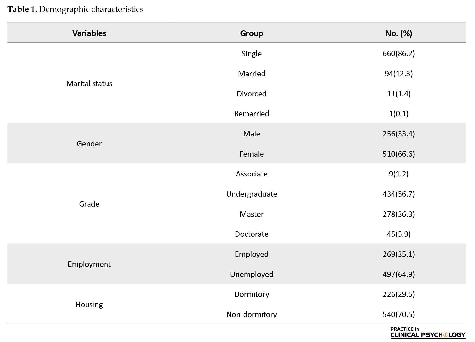 A total of 766 university students from Tehran participated in the study, of whom 510(66.6%) were women and 256(33.4%) were men. The participants were between 18 and 70 years old (Mean±SD 24.89±7.02). The education levels were 1.2%, 56.7%, 36.3%, and 5.9% for associate degrees, undergraduate, master’s, and doctoral programs, respectively. Most participants were single (86.2%), and 12.3% were married. The employment ratio was 35.1% versus 64.9% unemployed. Regarding residence, 29.5% of the respondents lived in boarding hostels, whereas 70.5% lived off-campus (