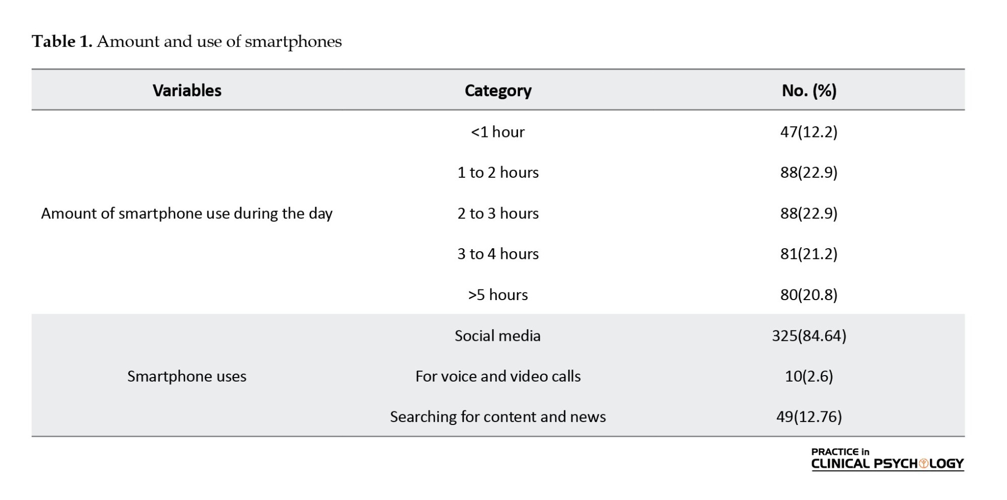 Table 1 shows the amount and types of smartphone usage, with most participants using their smartphones for one to three hours a day, primarily for social media.