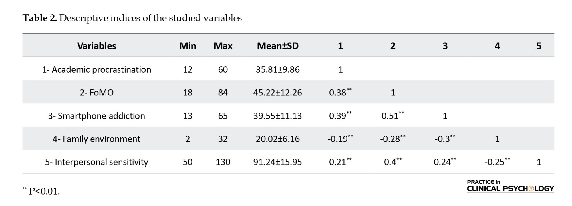 The present study examined the relationships between interpersonal sensitivity, family environment, and academic procrastination among adolescent girls. The findings revealed significant positive correlations among academic procrastination, FoMO, smartphone addiction, and interpersonal sensitivity. In contrast, family environment demonstrated significant negative correlations with academic procrastination, FoMO, and smartphone addiction. The observed association between smartphone addiction and academic procrastination is consistent with prior studies (Geng et al., 2018; Rozgonjuk & Kattago, 2018; Aznar-Díaz et al., 2020; Imani & Zakeri, 2023). Social media platforms satisfy the innate human need for social connection and provide continuous social rewards that activate the brain’s reward system (Meshi et al., 2015). Checking smartphones for notifications often becomes an automatic, impulsive behavior performed without conscious awareness (Shapka, 2019). Excessive time spent browsing the internet and engaging with social media can result in neglect of academic responsibilities, thereby fostering procrastination (Aznar-Díaz et al., 2020).