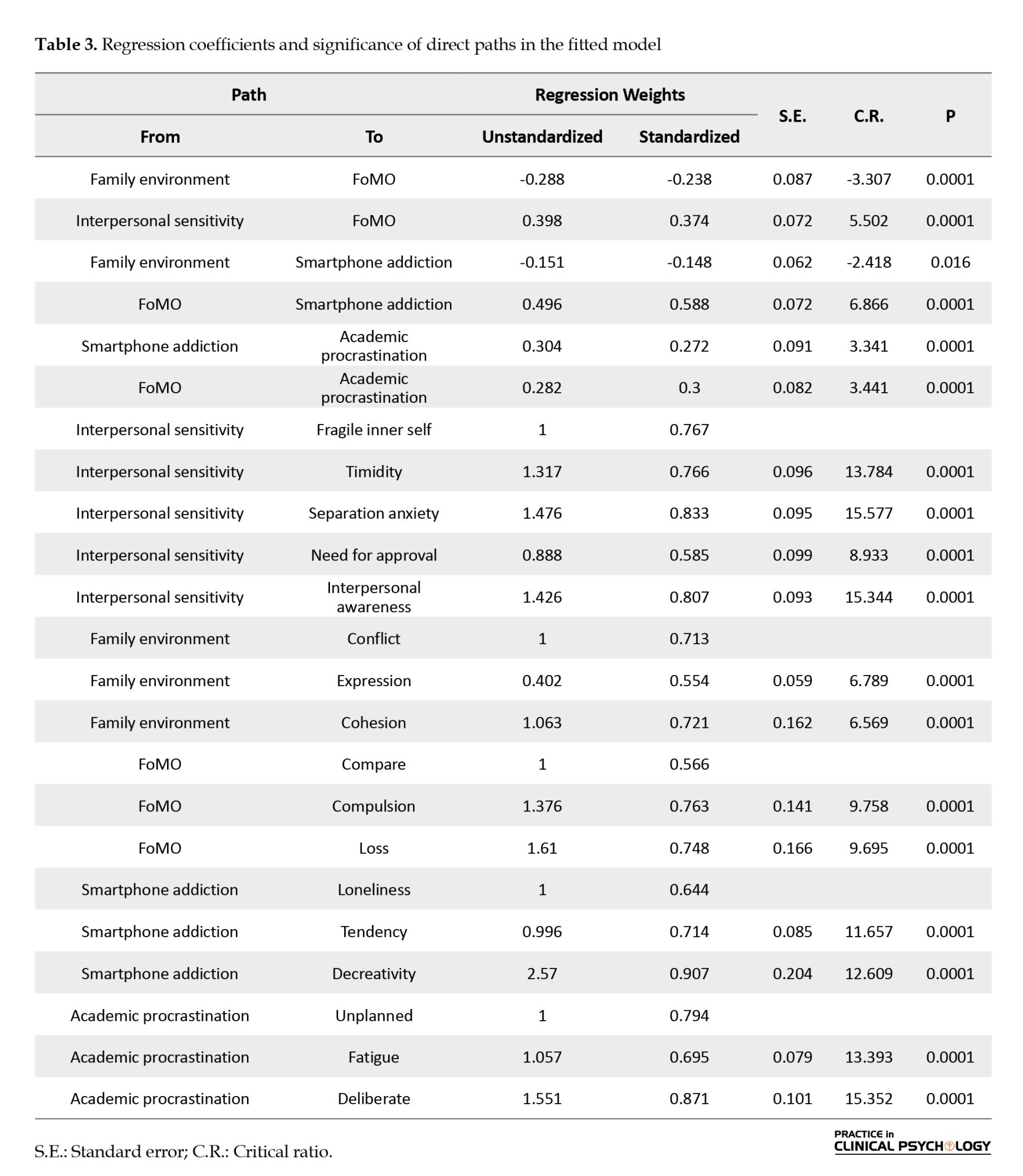 In the initial model, direct paths were drawn from interpersonal sensitivity and family environment to academic procrastination, which were removed in the revised model due to their non-significance. Also, the direct path from interpersonal sensitivity to smartphone addiction was removed due to the non-significance of the effect. The proposed model was fitted as shown in Figure 1, and the results of the direct paths are given in Table 3.