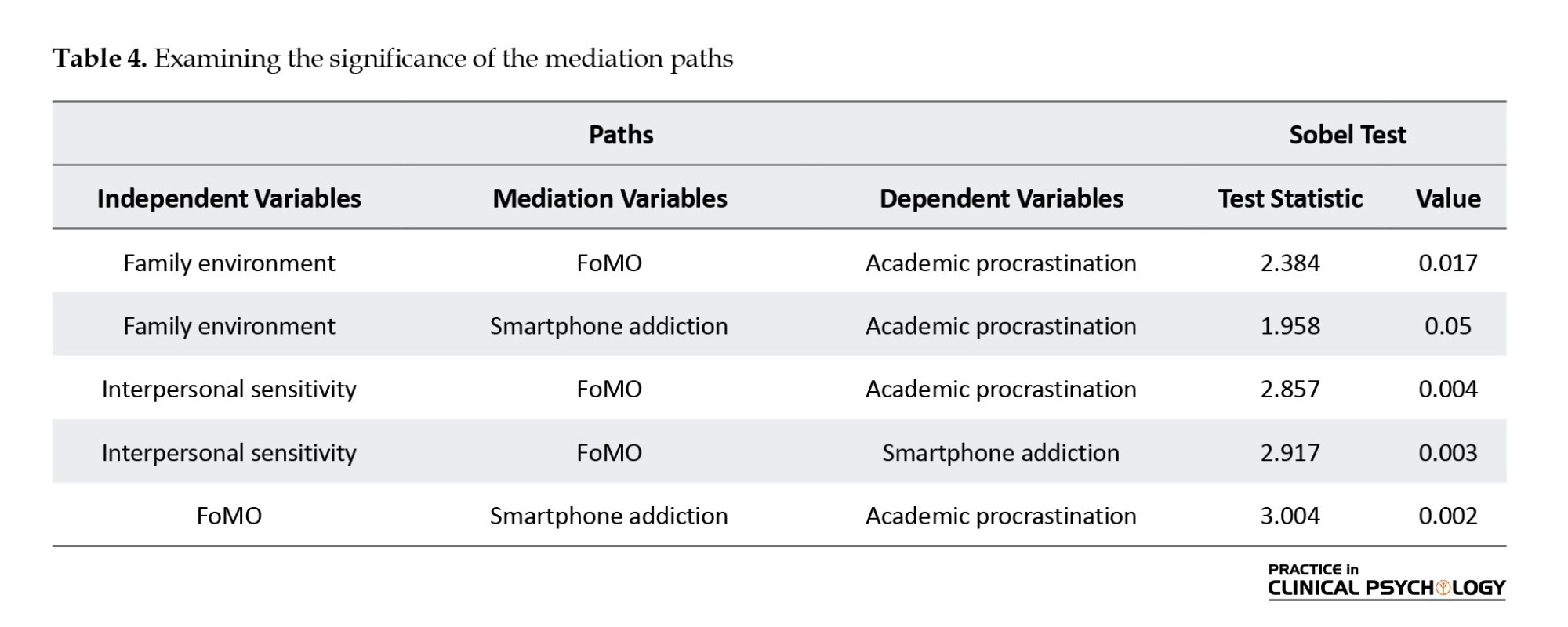 The results of the Sobel test in Table 4 show that FoMO significantly mediates the relationship between interpersonal sensitivity and academic procrastination. FoMO also significantly mediates the relationship between family environment and academic procrastination. According to the results of Table 4 and the Sobel test, it can be stated that interpersonal sensitivity affects smartphone addiction and academic procrastination through FoMO. In addition, the results show that smartphone addiction significantly mediates the relationship between family environment and academic procrastination. As Figure 1 shows, the variables of family environment and interpersonal sensitivity do not directly affect academic procrastination. The total effect size of the path of family environment on academic procrastination is -0.15, and the effect of interpersonal sensitivity on academic procrastination is 0.172.