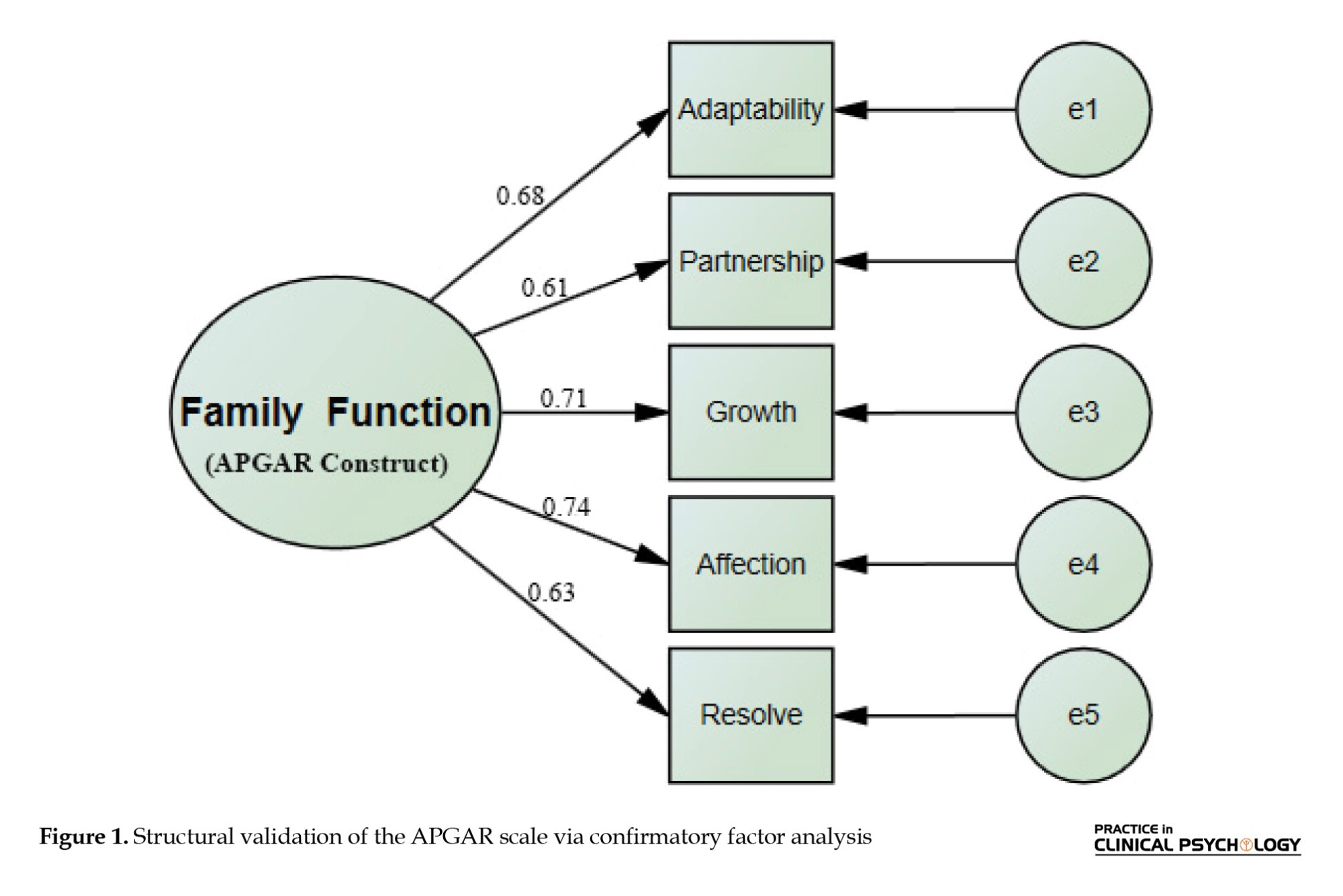 Based on previous studies, one latent variable and 5 subscales have been proposed for the APGAR scale. Consequently, a single latent factor was incorporated into the model specification (family function). Given the acceptable skewness and kurtosis values observed for the items, standardized coefficients were applied, and model parameters were estimated using the MLE approach (Willmer et al., 2019).