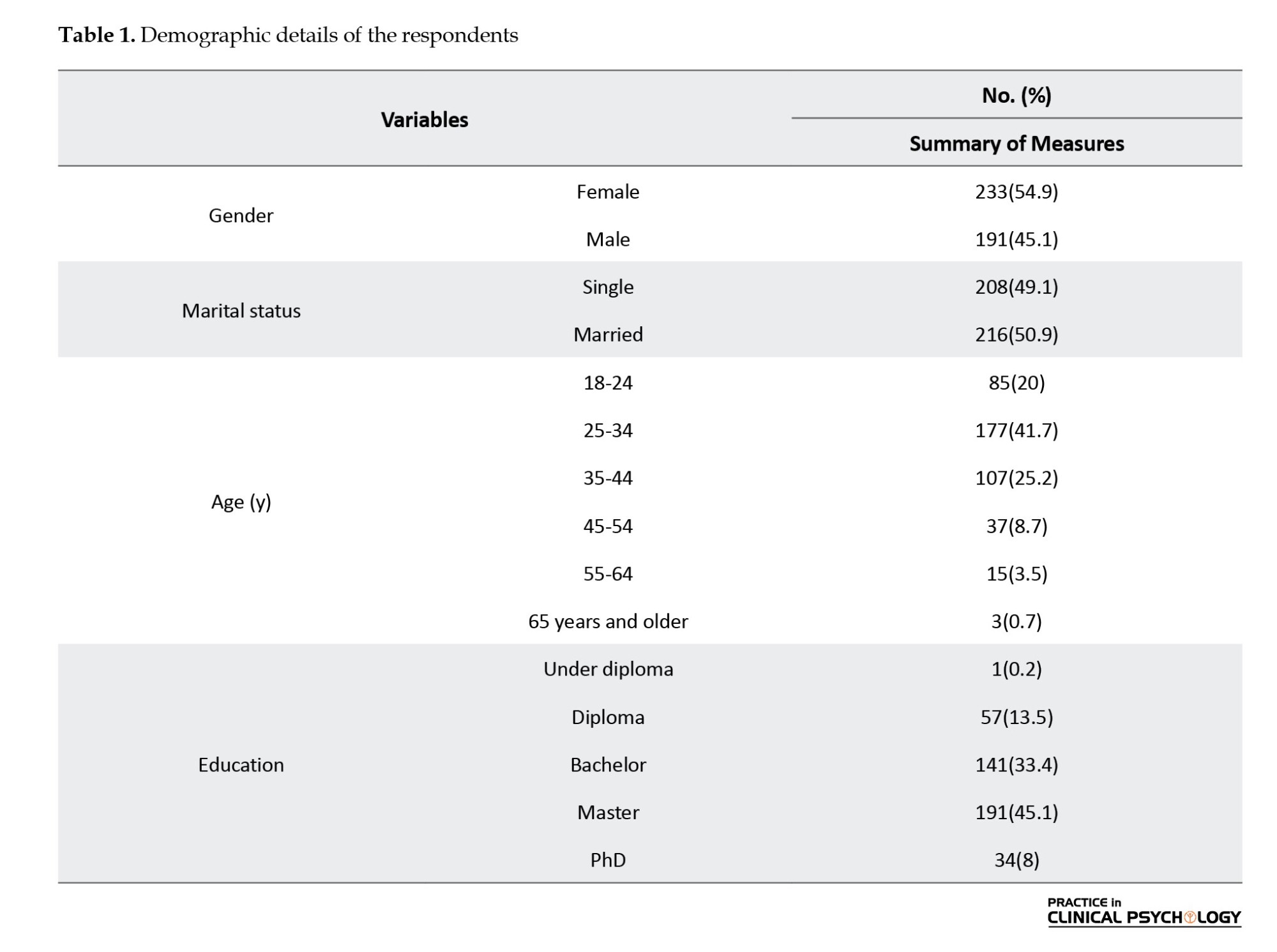 Participants voluntarily consented to take part in the study after receiving comprehensive information regarding its objectives. The study population comprised adult residents (over 18 years old) of Tehran City, Iran. Convenience sampling yielded a total of 424 participants for inclusion in the study. Eligibility for participation required being Iranian, 18 years or older, literate in Persian, and free from any clinically diagnosed psychiatric disorder. Participants who did not complete the questionnaires or did not meet the eligibility criteria were excluded from the final analysis. A preliminary pilot test was conducted with 30 participants to evaluate the comprehensibility and procedural integrity of the survey materials.
