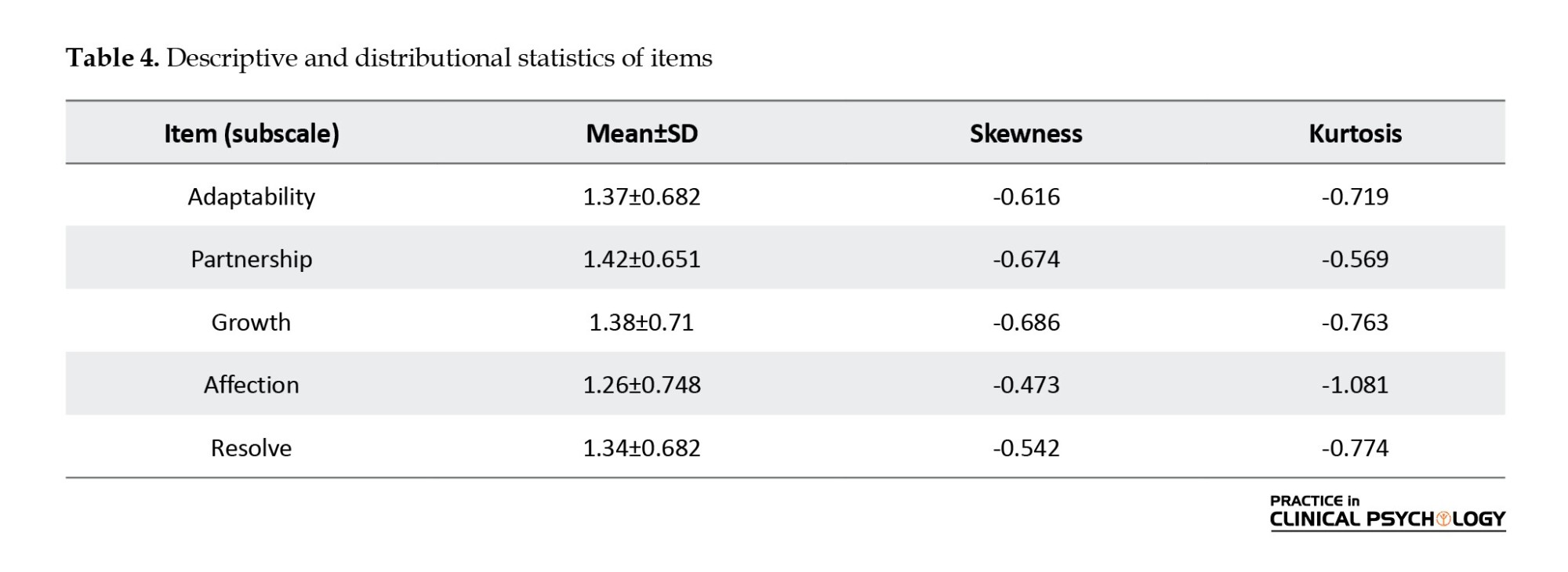 Before the evaluation of construct validity, the items were assessed in terms of skewness and kurtosis. Table 4 presents these findings in conjunction with the associated subscale mean values and standard deviations.