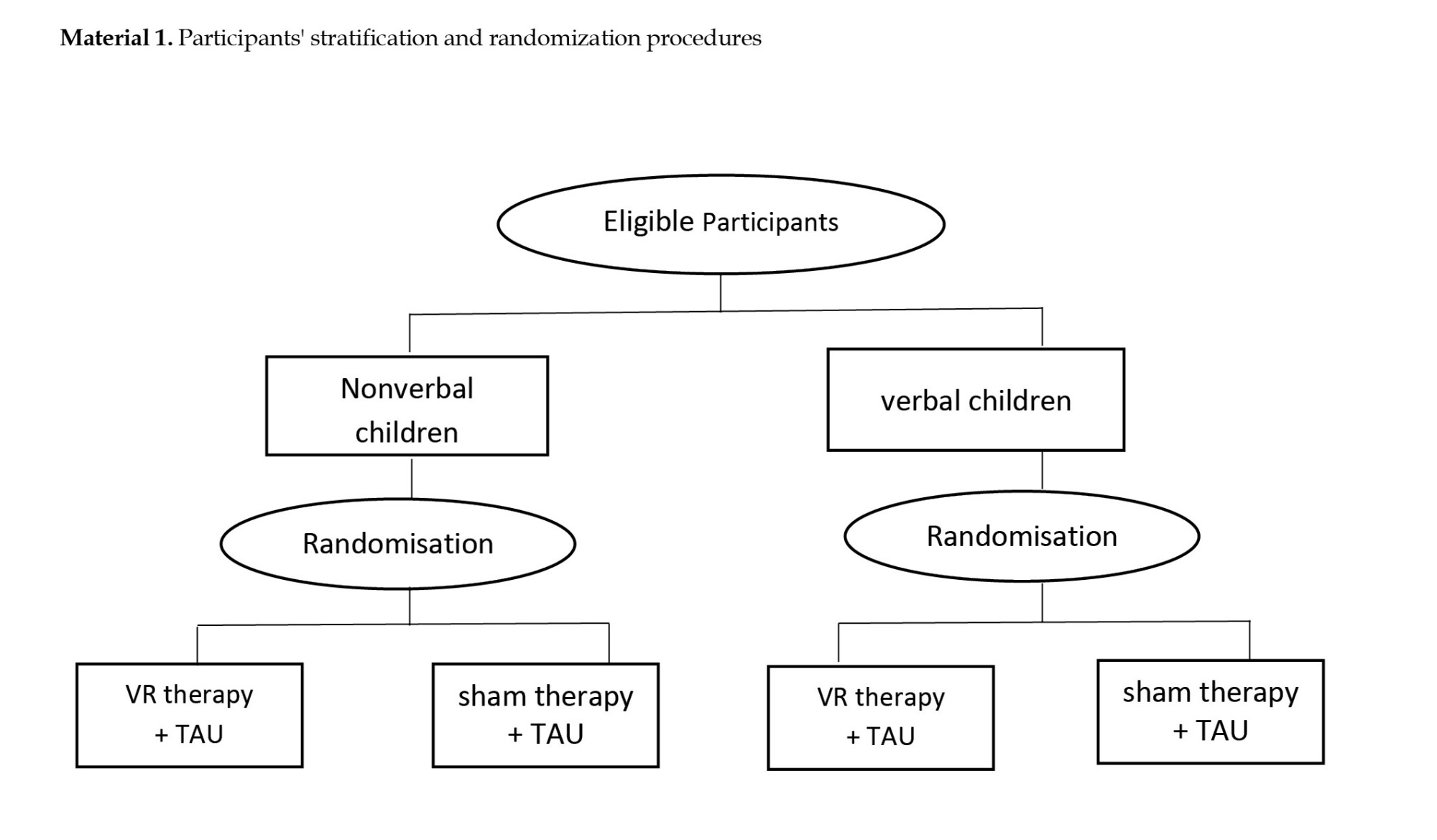 This study employs a 2 (training: VR therapy vs sham) × 2 (group: Verbal vs non-verbal) × 3 (time: Baseline, post-intervention, follow-up) mixed factorial design. The within-subject factor is time (three levels: T1 = baseline, T2 = post-intervention, T3 = one-month follow-up). The between-subject factors are training (two levels) and group (two levels). Accordingly, the study follows a two-arm, parallel-group, randomized, sham-controlled, single-blind trial with blinded outcome assessors. Participants are stratified by communication type (verbal vs non-verbal) in a 1:1 allocation ratio (Supplementary Material 1). The CONSORT (consolidated standards of reporting trials) flow diagram is provided in Figure 1, and the protocol adheres to the SPIRIT (standard protocol items: Recommendations for interventional trials) 2013 guidelines (Butcher et al., (2022).