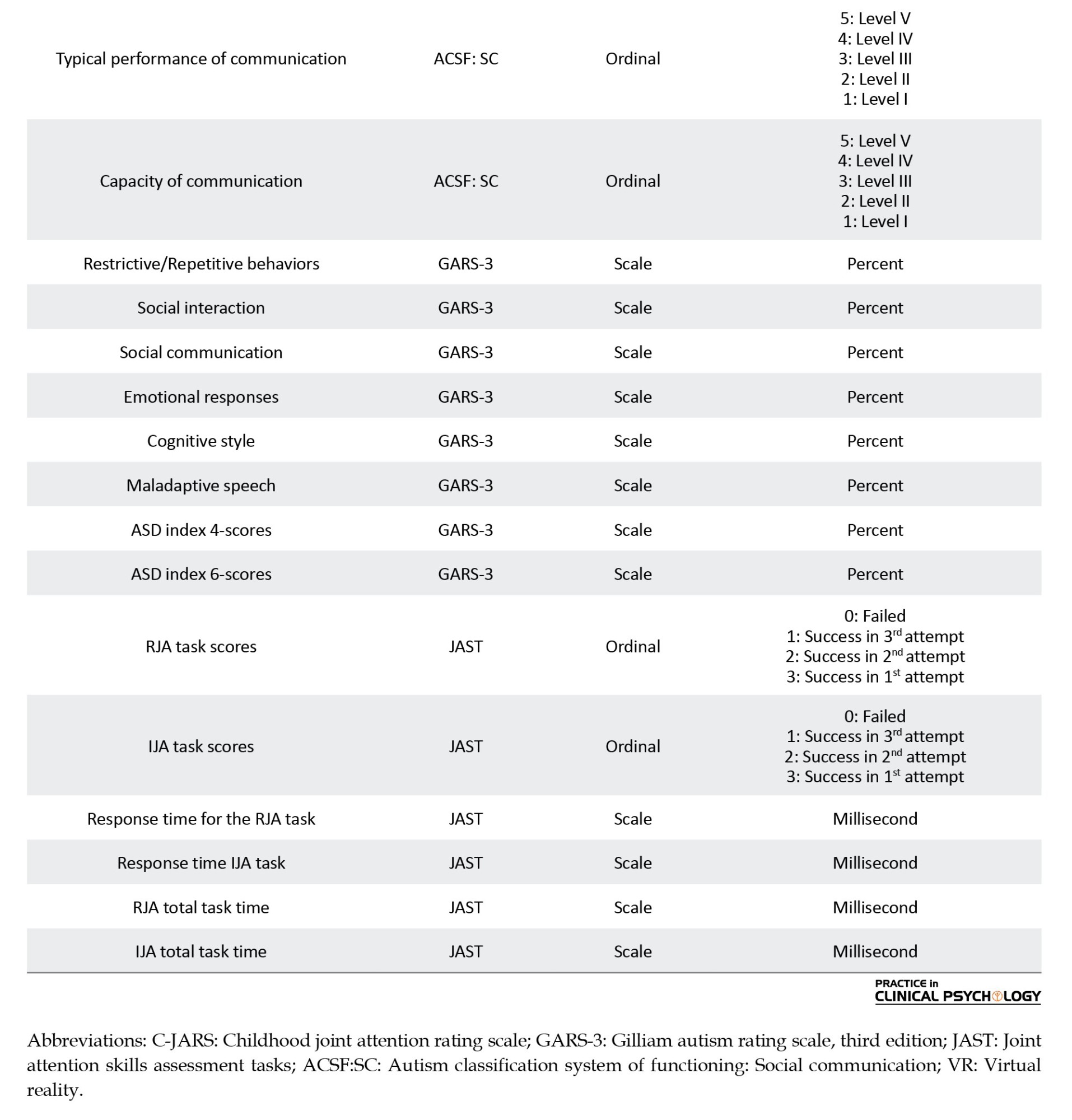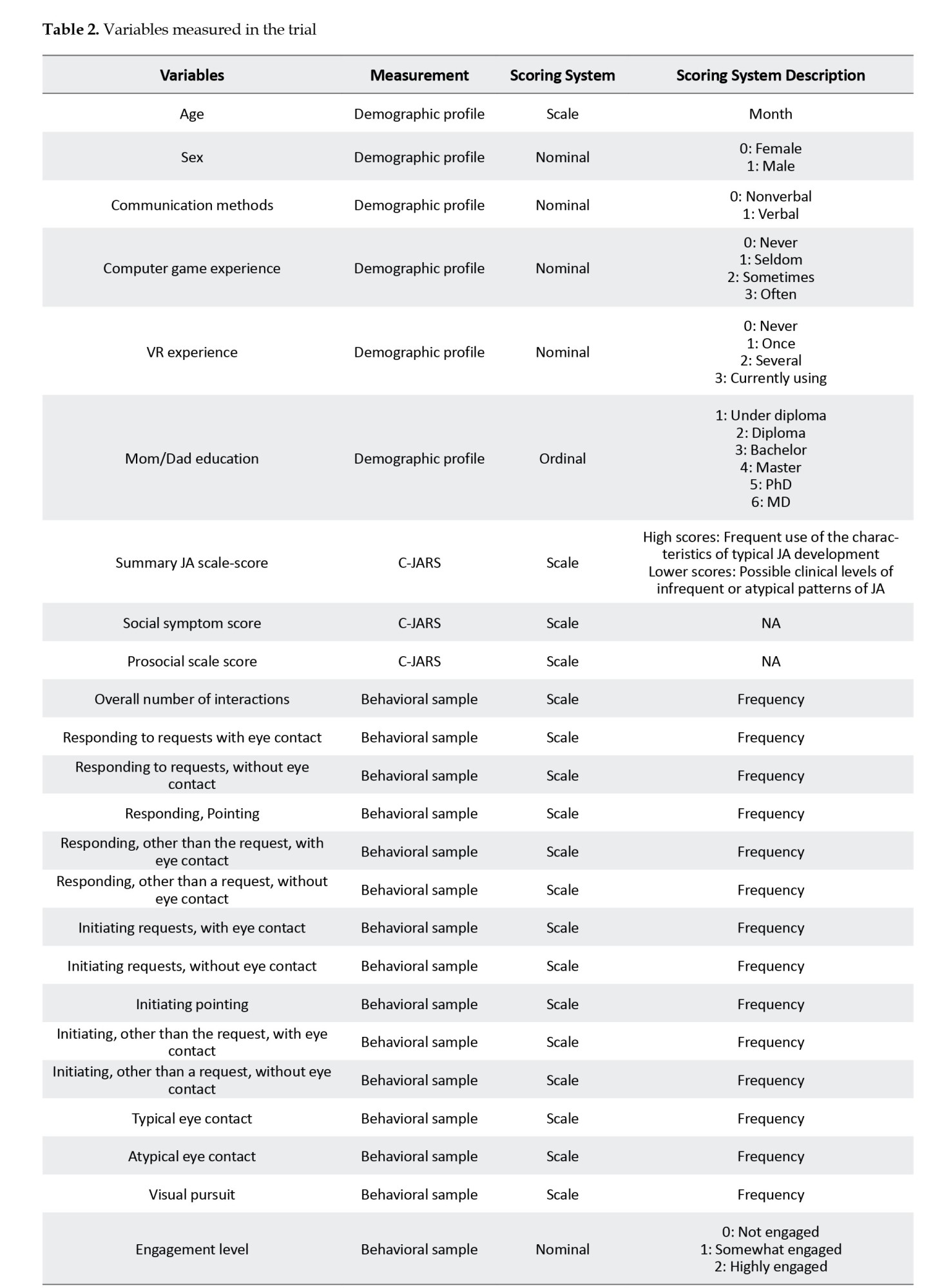 The primary outcome of this study will be the assessment of JA skills, specifically RJA and IJA. Regrettably, previous studies on the enhancement of JA skills using VR-based intervention have not reached a consensus on the use of JA measures (Yazdanian et al., 2023). In this study, we will compile a behavioral sample of participants, drawing inspiration from the measure prepared by Ravindran et al. (2019). This measure, designed based on the communication and symbolic behavior scale (CSBS) (Wetherby & Prizant, 2002), aims to assess JA skills within a broader framework of social interaction. The goal is to evaluate gestural interaction skills (including the presence or absence of eye contact and pointing) under optimal conditions. This behavioral sample emphasizes key behaviors in JA skills, such as responding to interactions (with or without eye contact, with pointing) and initiating interactions (with or without eye contact, with pointing). These interactions could be intended for making requests or for other purposes. The measure can be administered swiftly, incorporates play-based activities suitable for school-aged children, and focuses on the key JA behaviors targeted in our study. Detailed information about the measure can be found in Butcher et al's study (Butcher et al., 2022).