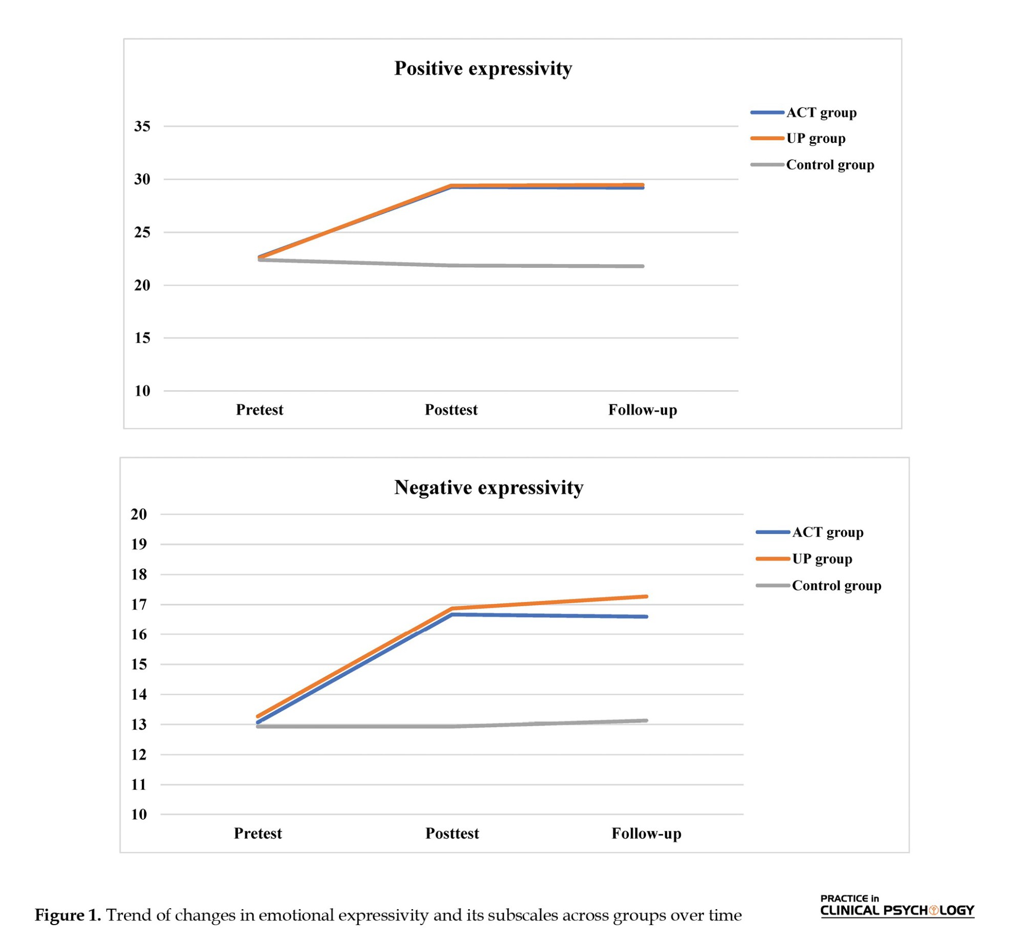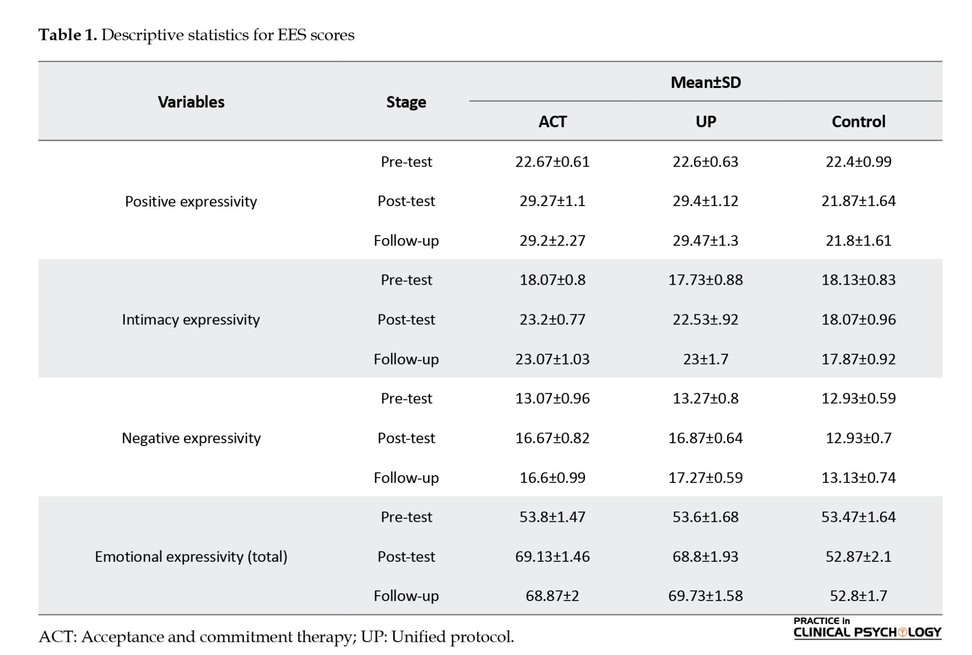 Table 1 presents the Mean±SD of the EES scores and their subscales (positive, intimacy, and negative expressivity, and total emotional expressivity) across pre-test, post-test, and 3-month follow-up for the ACT, UP, and control groups. At pre-test, all groups had comparable EES scores, indicating no baseline differences. Both ACT and UP groups showed substantial improvements in all EES subscales and total scores at post-test compared to the control group, which remained largely unchanged. These improvements were maintained at the three-month follow-up, suggesting sustained therapeutic effects (Figure 1).