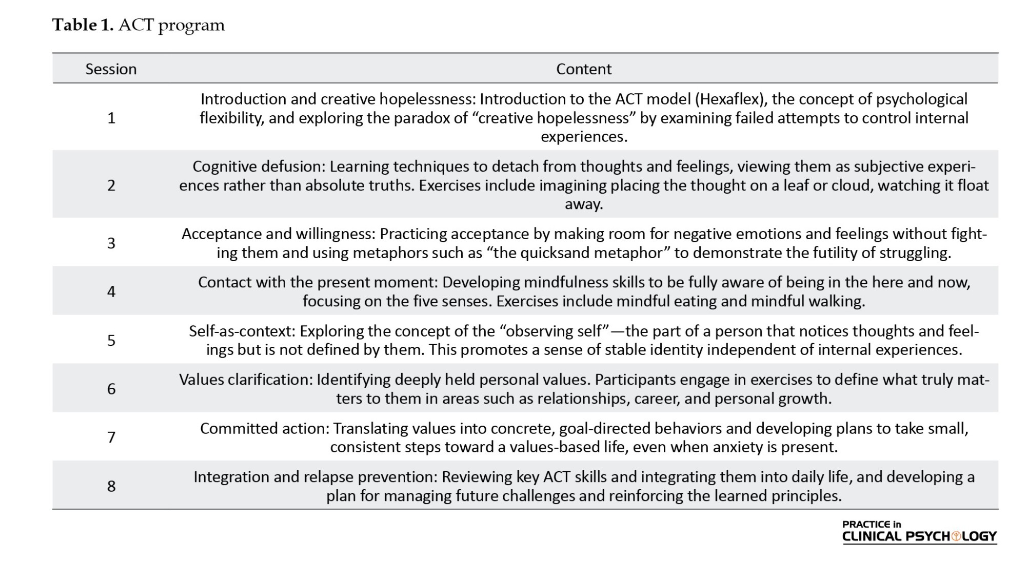 Caletti, E., Massimo, C., Magliocca, S., Moltrasio, C., Brambilla, P., & Delvecchio, G. (2022). The role of the acceptance and commitment therapy in the treatment of social anxiety: An updated scoping review. Journal of Affective Disorders, 310, 174-182. [DOI:10.1016/j.jad.2022.05.008] [PMID]