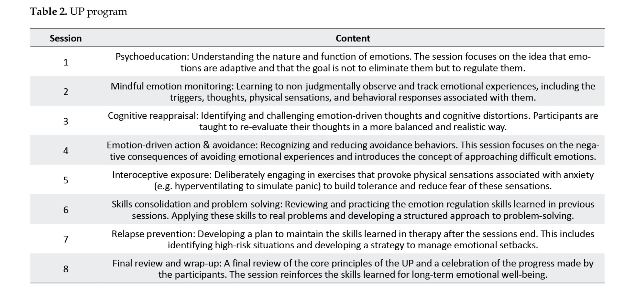 Similarly, the significant improvement in emotional expressivity following the UP intervention can be attributed to its focus on emotional regulation. The UP operates on the transdiagnostic assumption that emotional disorders share common underlying mechanisms, such as a tendency to avoid or suppress emotional experiences (Sakiris & Berle, 2019). UP teaches a structured set of skills designed to increase emotional awareness, provide tools for cognitive reappraisal, and encourage a direct, non-avoidant approach to emotion-driven actions (Nikdanesh et al., 2025). For women with SAD, these skills counteract the fear-driven suppression of emotions, enabling freer expression of both positive and negative emotions. This finding is consistent with Kargar et al. (2023), who found UP enhanced emotional expression in infertile women. However, our study extends these findings to SAD, highlighting UP’s applicability to anxiety-related emotional deficits.