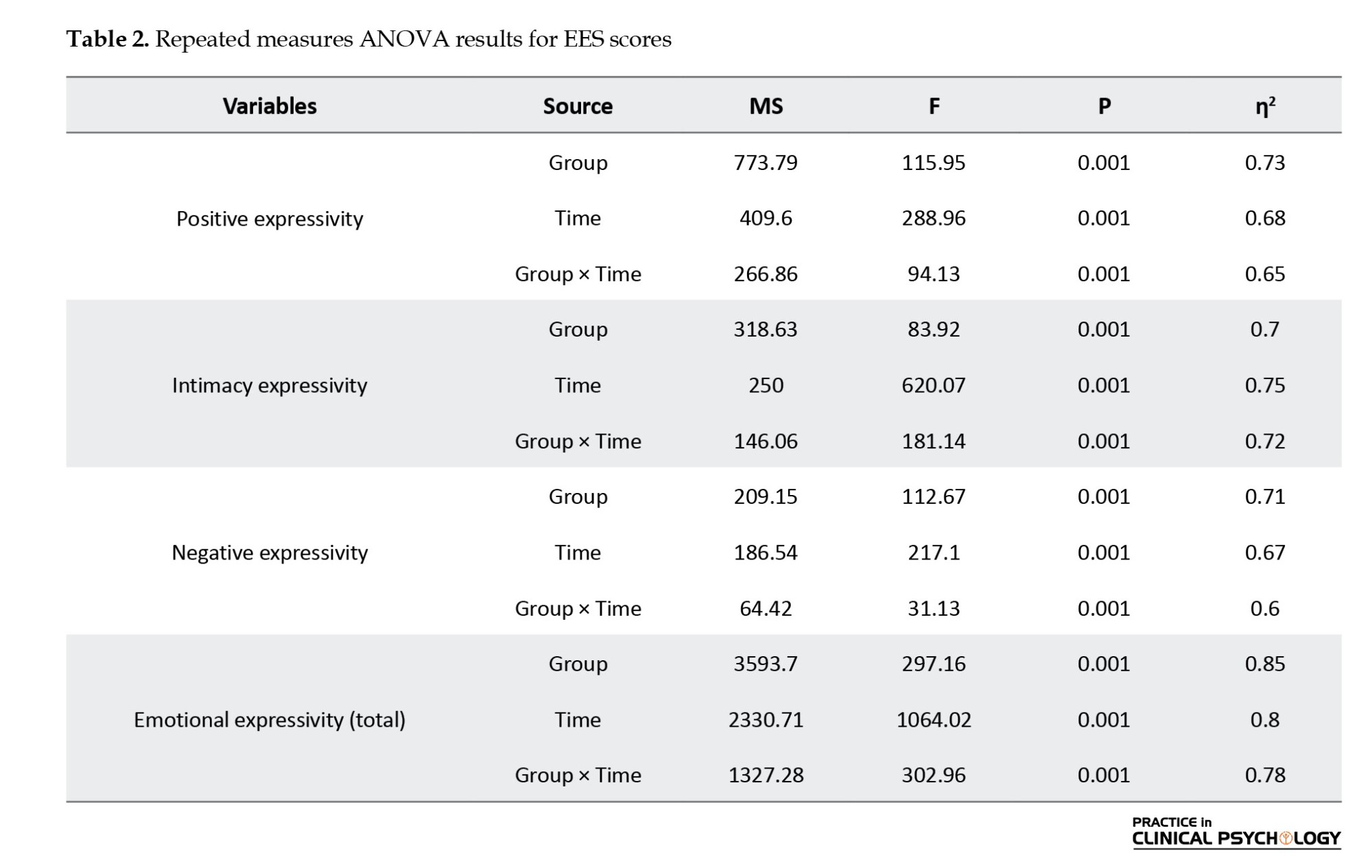Data were analyzed using the SPSS software, version 27. Descriptive statistics were used to summarize the sample characteristics. To test the hypotheses, a repeated measures analysis of variance (ANOVA) was performed to examine the effectiveness of the interventions and their long-term effects on the EES scores. The significance level was set at P<0.05.