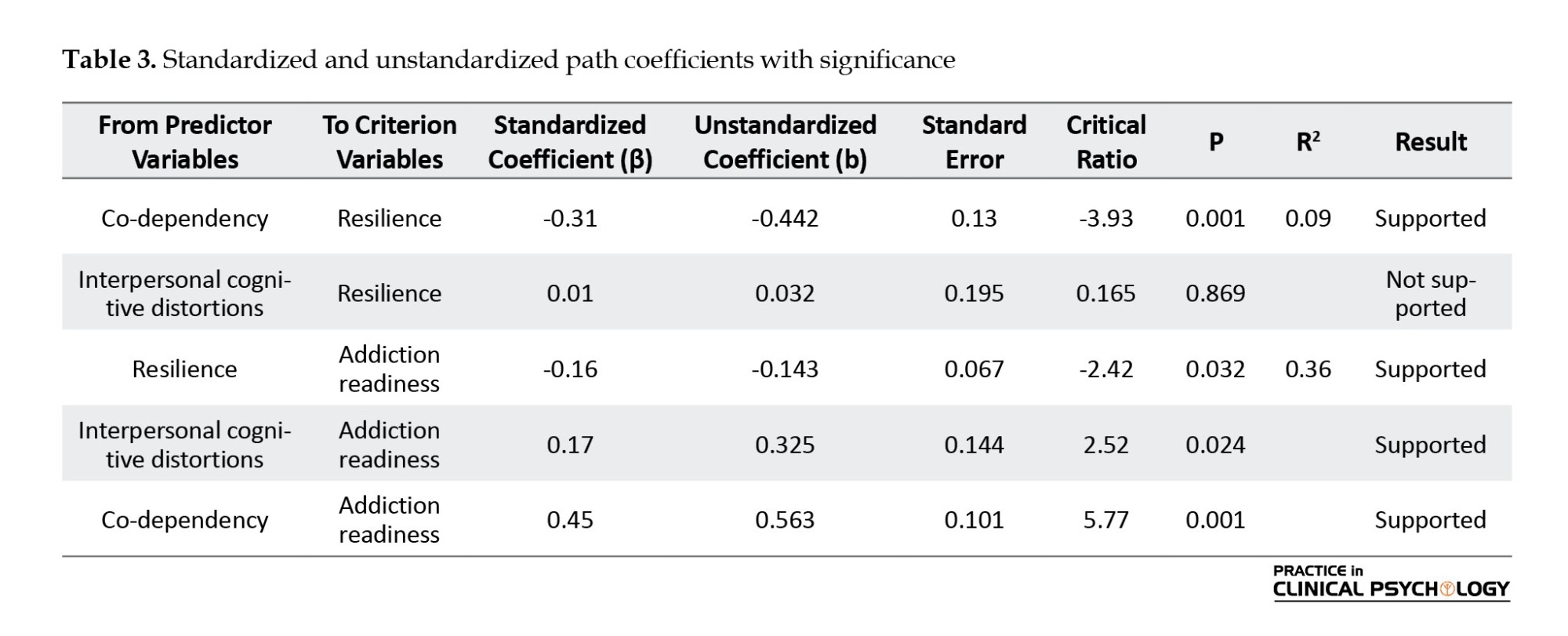 The results of Table 3 indicate that all direct paths in the model, except for the path between interpersonal cognitive distortions and resilience, are statistically significant. Specifically, co-dependency has a positive and significant effect on addiction readiness; resilience plays a significant negative role in reducing addiction readiness; interpersonal cognitive distortions have a direct and positive impact on addiction readiness; however, their effect on resilience was not significant. Additionally, the model was able to explain 36% of the variance in addiction readiness through the variables included.