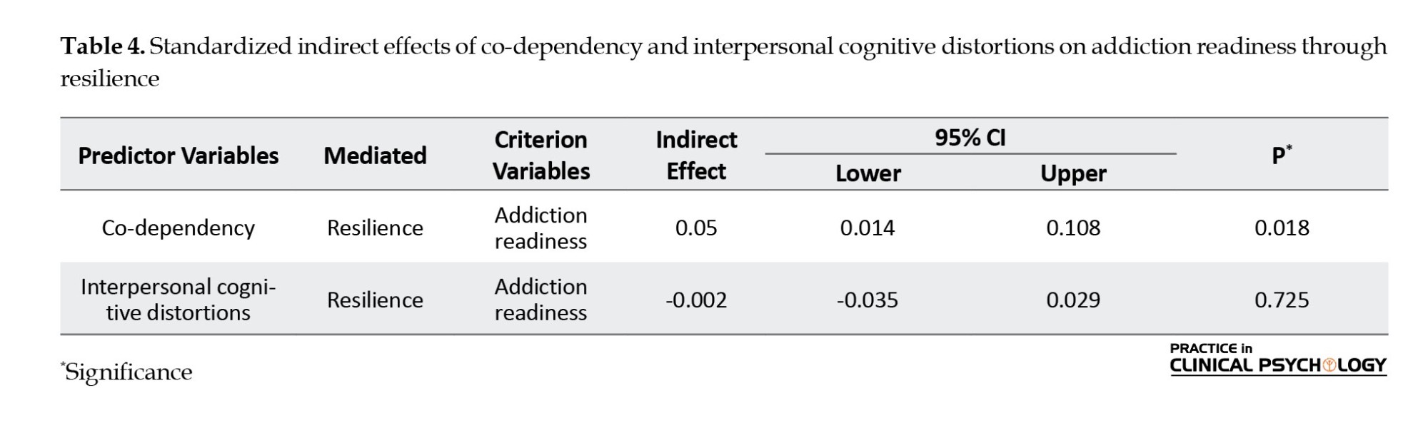 According to Table 4, the indirect effect of co-dependency on addiction readiness through resilience is significant (P=0.018), as the 95% confidence interval for this effect does not include zero. Therefore, resilience plays a significant mediating role in the relationship between co-dependency and addiction readiness. In contrast, the indirect effect of interpersonal cognitive distortions on addiction readiness through resilience is not significant (P=0.725), since the confidence interval includes zero. Hence, resilience does not mediate this relationship.