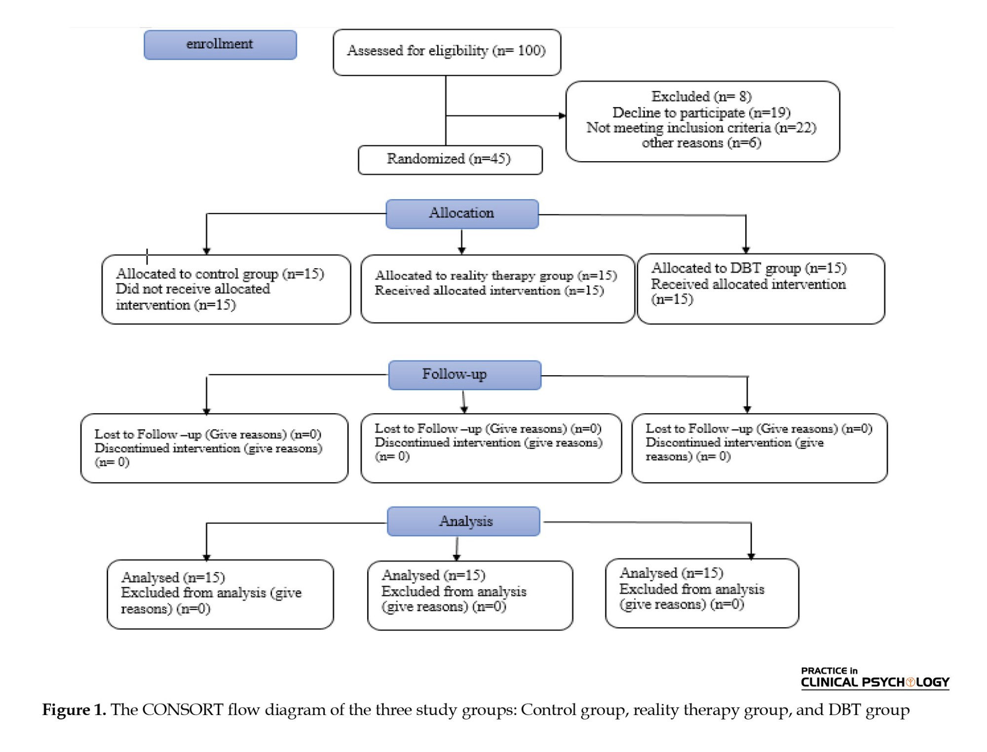 In this research, the SOLAR model, presented by Linehan (2015), was used to teach DBT skills to adults. This model is based on the DBT skills training manual, translated by Alavi (2015). It consisted of 12 sessions of 90 minutes each. For teaching the reality therapy protocol, the book “reality therapy for the 21st century” written by Robert Wubbolding (2013) and translated by Sahabi (2019), along with the “12-week weight loss program” by Kim Allover translated by Sahabi and Eskandari (2019), were utilized in 12 sessions of 90 minutes each. It is worth mentioning that the training was conducted by the author in coordination with the professors..