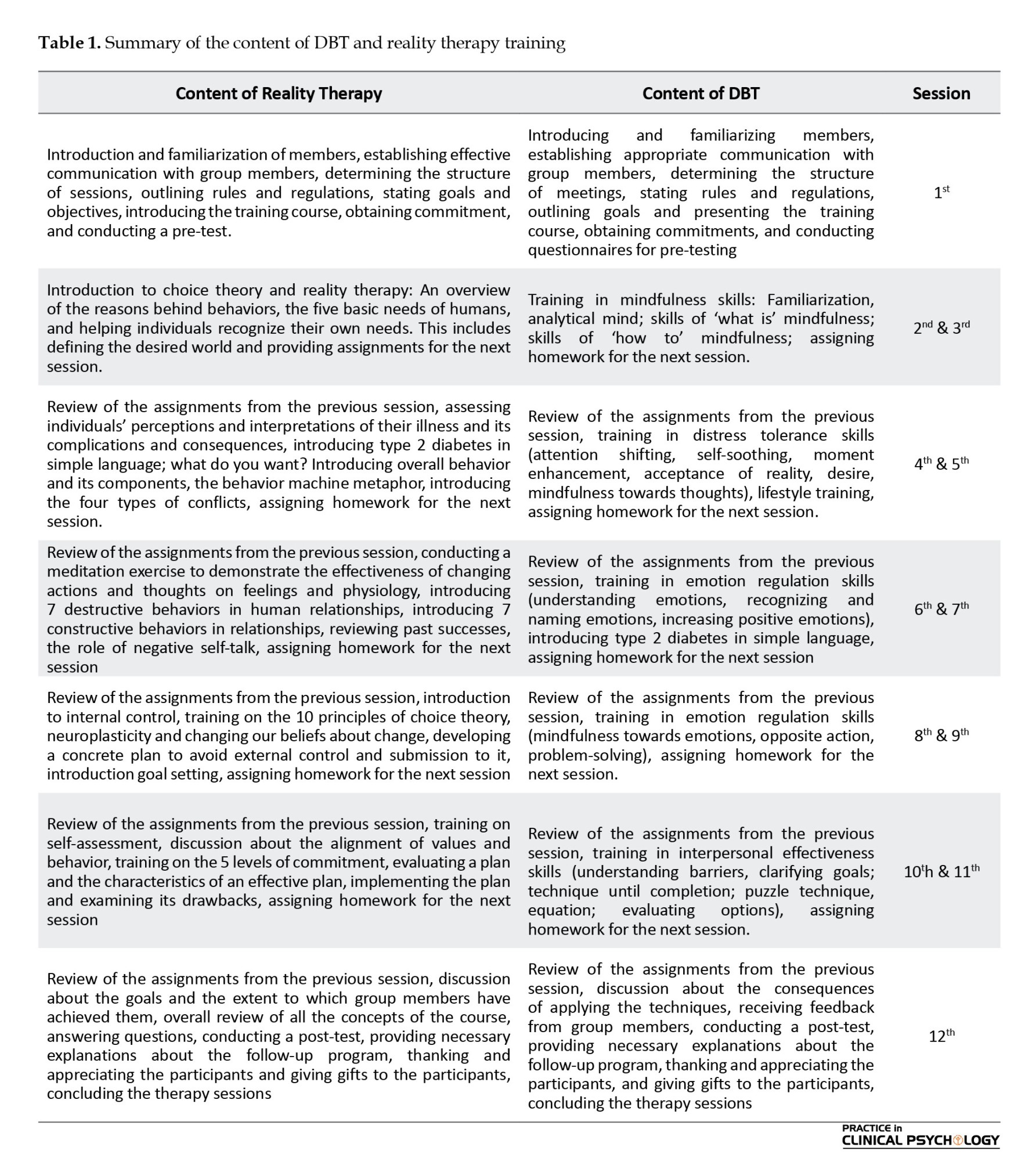 One of the therapeutic approaches influencing the treatment process for patients with type 2 diabetes is dialectical behavior therapy (DBT). DBT is a method derived from cognitive-behavioral therapy that focuses on behavioral changes (McKay et al., 2007). In DBT, the treatment orientation helps patients control their activities, teach behavioral skills, solve life problems, seek pleasure, and achieve a better emotional state (Ben-Porath, 2015). DBT proposes four intervention components: Fundamental mindfulness, distress tolerance, emotional regulation, and interpersonal effectiveness. Therefore, using DBT skills and techniques can lead to better emotional self-control and manage troublesome and intense emotions that often stem from genetic foundations and adverse experiences (Gallagher et al., 2020; Kazemi et al., 2021).