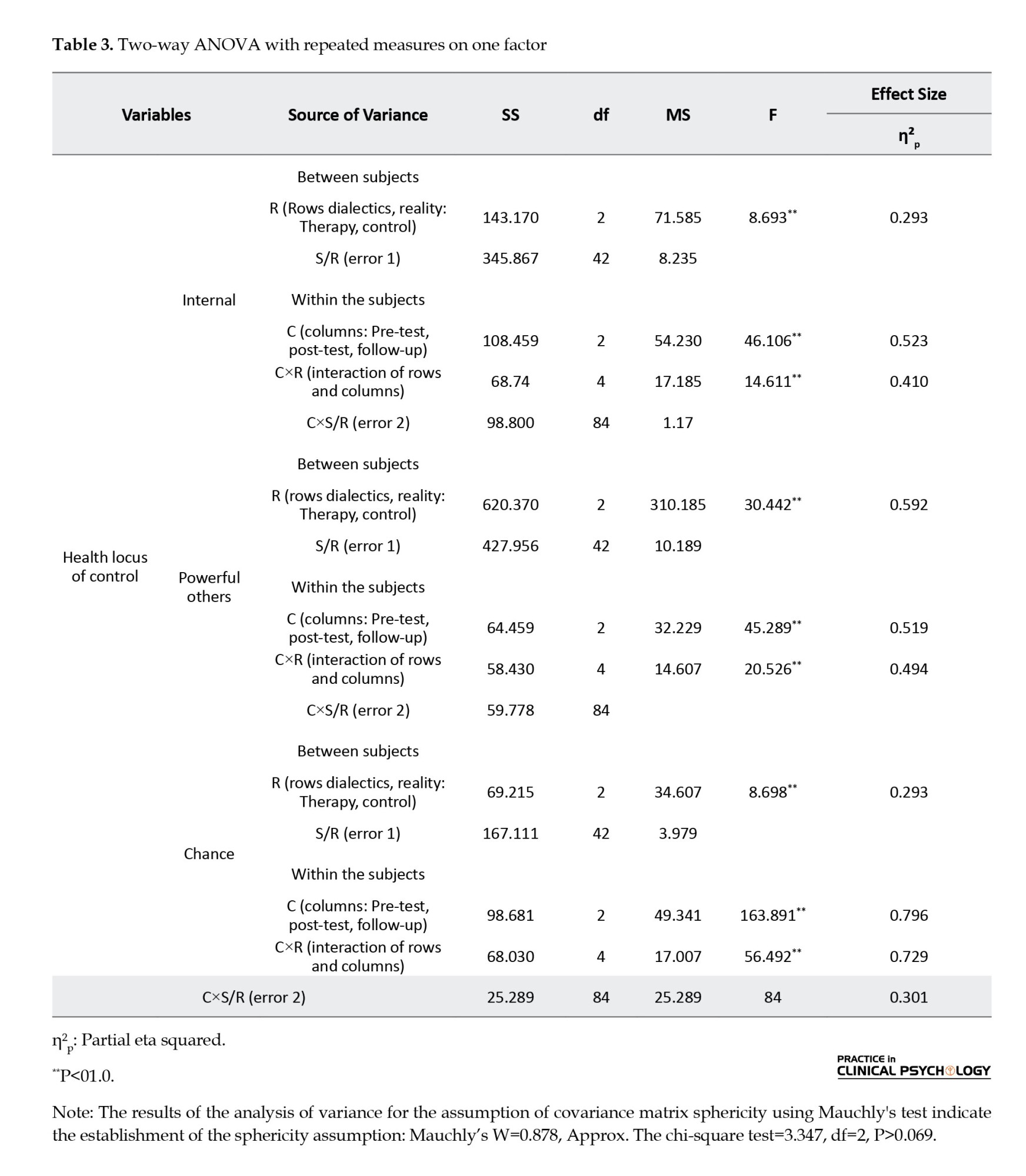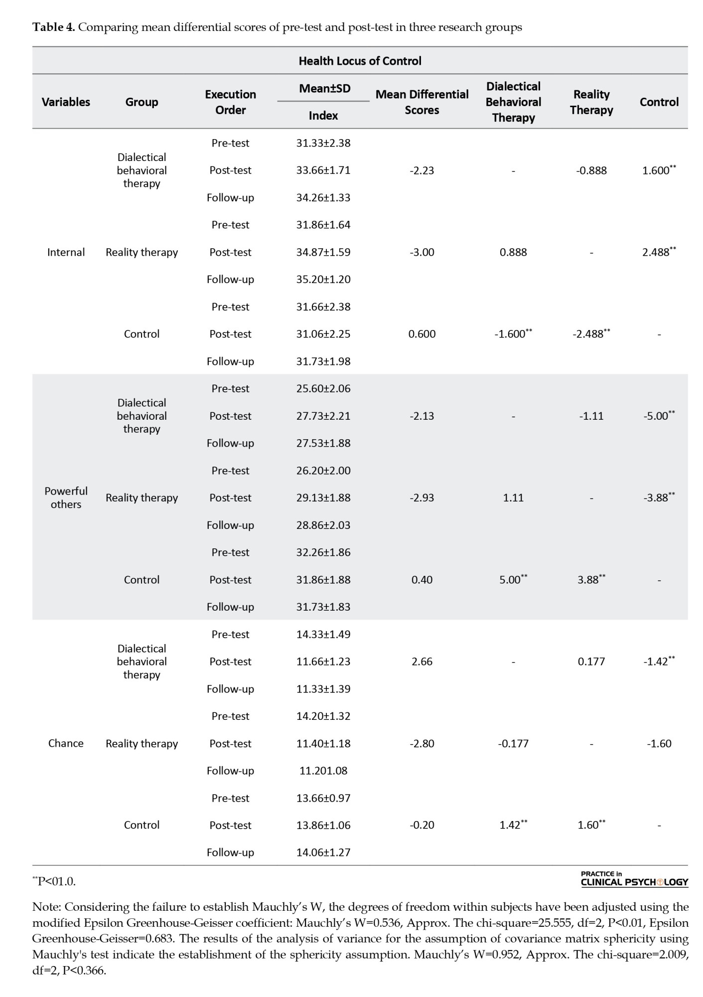 Therefore, the results show a significant difference in the mean scores of health locus of control between the experimental groups and the control group. Furthermore, to examine the effectiveness of the two treatments in the research and compare them, the mean differences of paired scores from the pre-test and post-test in three research groups were compared using the Bonferroni post hoc test, the results of which can be seen in Table 4.