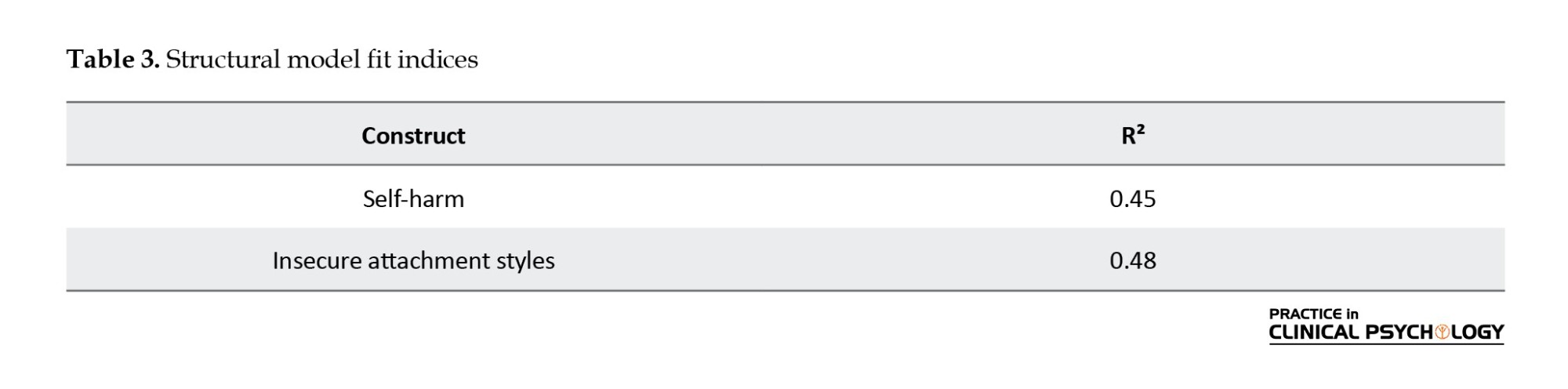 According to Table 3, the R-squared values for self-harm (0.45) and insecure attachment styles (0.48) are obtained, indicating a good fit of the model.