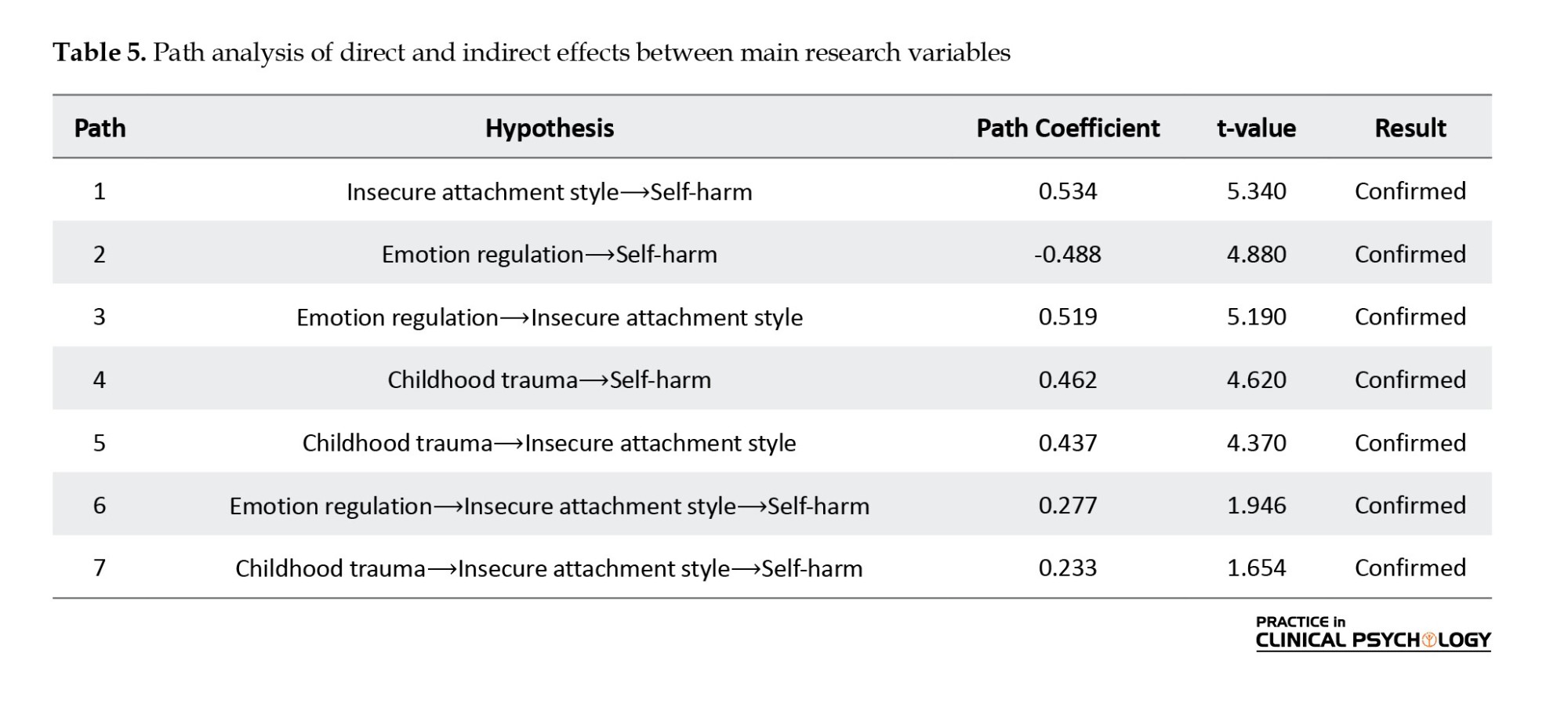The present study aimed to develop a structural model to explain self-harm based on cognitive emotion regulation and childhood trauma, with the mediating role of attachment styles among students in Ardabil. The results of hypothesis 1 revealed a significant positive relationship between self-harm and cognitive emotion regulation. This finding aligns with the results of Putri and Hariyono (2023), Carvalho et al. (2023), Natividad et al. (2024), and Warne et al. (2023). In explaining this result, it can be stated that cognitive emotion regulation refers to processes through which an individual identifies, processes, and regulates their emotions to act effectively in various situations. This process can involve either avoiding negative emotions or actively managing and modifying them. Individuals with difficulties in cognitive emotion regulation are generally unable to employ effective and adaptive strategies to manage intense emotions and psychological challenges. For these individuals, the lack of emotion regulation skills may lead to maladaptive strategies such as rumination, self-blame, or immediate relief behaviors like self-harm. Various theories, including emotion regulation theory and self-regulation theory, emphasize the need for strategies that help individuals regulate negative emotions and reduce emotional harm. When an individual lacks the necessary abilities in this area, particularly in stressful and crisis, they may resort to self-harm as a means to alleviate intense emotions or provide temporary relief from psychological pain. In student populations, where academic, social, and family pressures can intensify negative emotions and anxiety, such behaviors emerge as a way to control feelings and cope with daily stress.